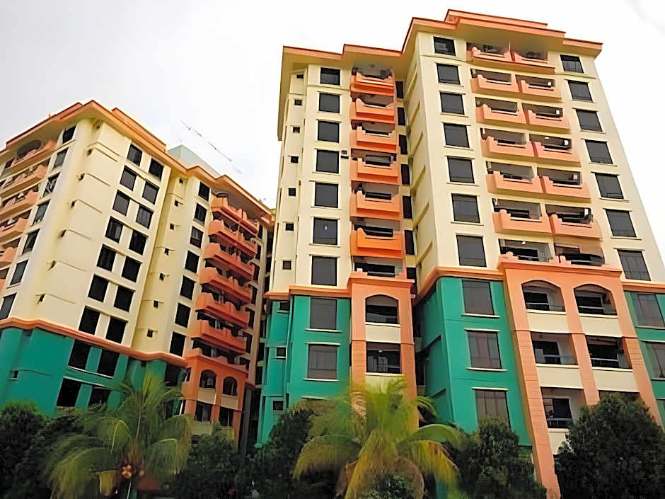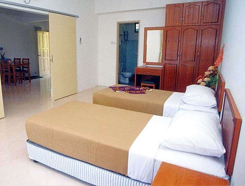 A spacious apartment featuring a separate living area and a kitchenette with refrigerator.