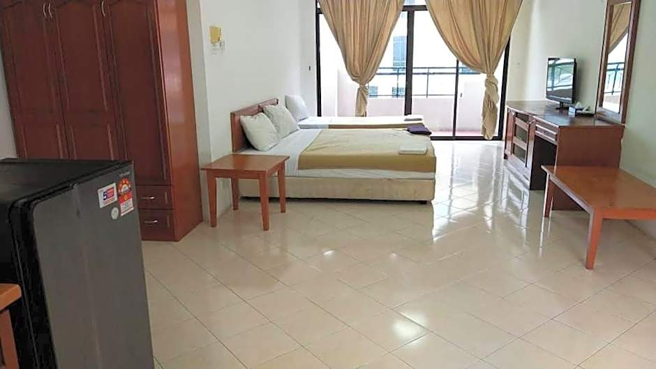 A large apartment featuring a separate living area and a kitchenette with refrigerator.